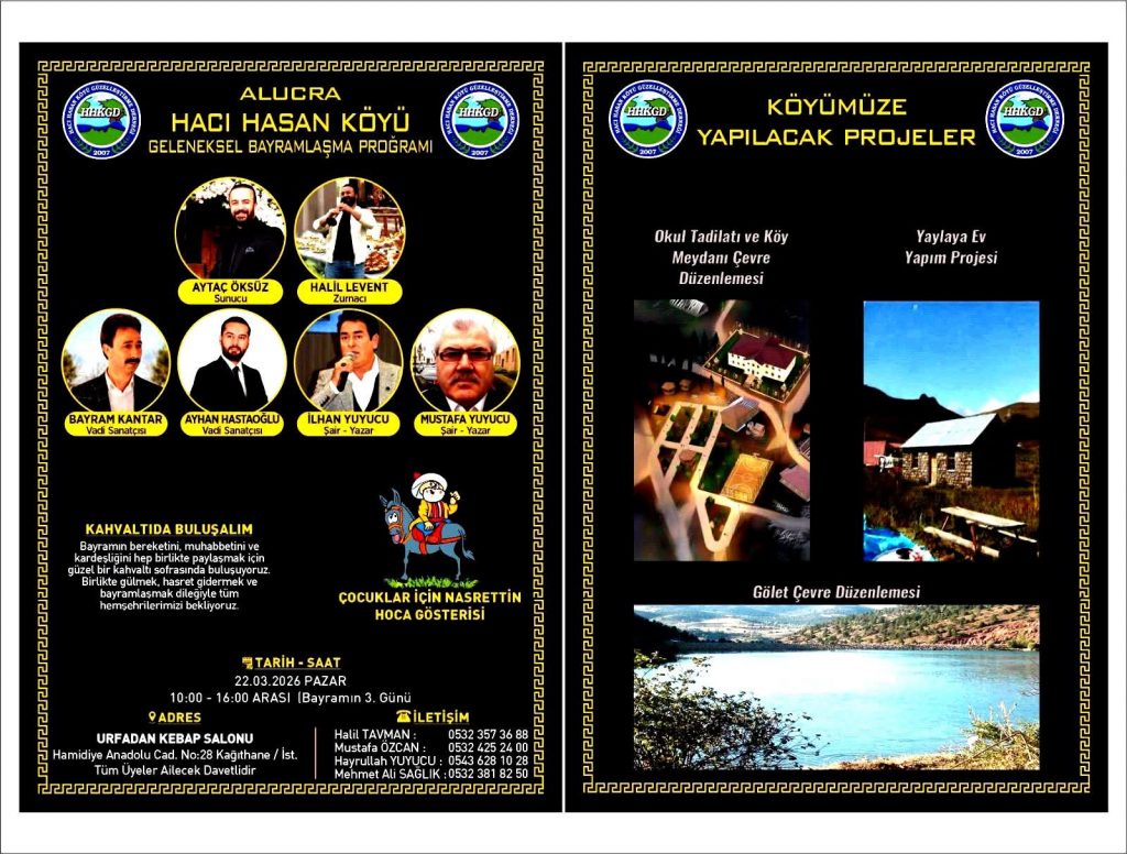İstanbul’da yaşayan Alucralılar, 2026 yılı Ramazan Bayramı’nın coşkusunu dev bir organizasyonla taçlandırıyor. Hacı Hasan Köyü Güzelleştirme Derneği tarafından organize edilen “Geleneksel Bayramlaşma Programı”, 22 Mart 2026 Pazar günü (Bayramın 3. günü) saat 10:00 ile 16:00 arasında Kağıthane’deki Urfadan Kebap Salonu’nda gerçekleştirilecek.