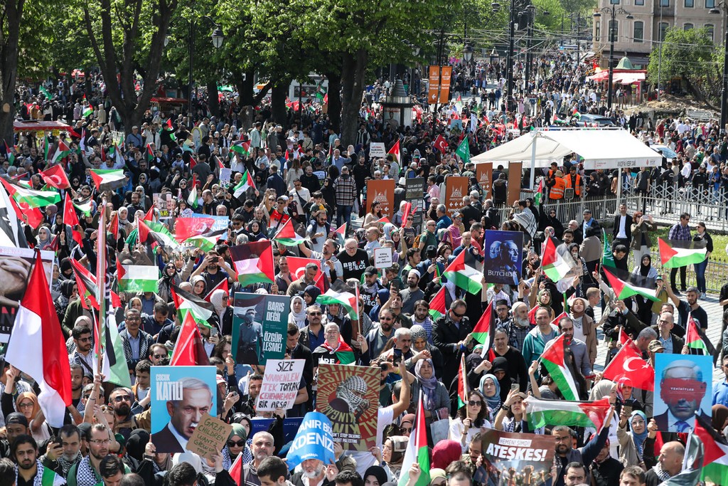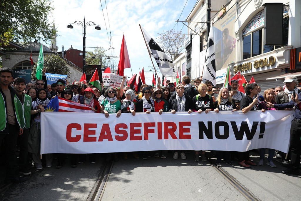 Yürüyüş eylemi, saat 14.00’da Beyazıt Meydanı’ndan başladı. On binlerce kişinin katıldığı yürüyüşte, Filistin’e destek mesajı verildi, işgalci İsrail’in Gazze’de altı ayı aşkın süredir sürdürdüğü yoğun saldırıları ve devam eden ablukası protesto edildi. Yürüyüşte, “Katil İsrail Filistin’den Defol, Katil İsrail işbirlikçi ABD, Free free Palestine” sloganları atıldı. Yürüyüş sırasında güzergâh üzerindeki vatandaşlar ve turistler de eyleme destek verdi. Katılımcılar, kortej halinde Ayasofya Camii Meydanı’na kadar yürüdü.