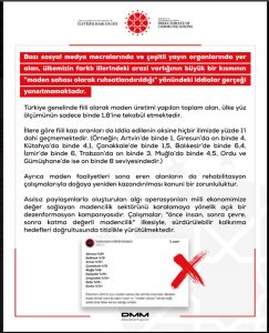 – Asılsız paylaşımlarla oluşturulan algı operasyonları milli ekonomimize değer sağlayan madencilik sektörünü karalamaya yönelik açık bir dezenformasyon kampanyasıdır. Çalışmalar; “önce insan, sonra çevre, sonra katma değerli madencilik” ilkesiyle, sürdürülebilir kalkınma hedefleri doğrultusunda titizlikle yürütülmektedir.”