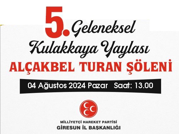 MHP İl Başkanı Abdullah Karaosmanoğlu İl Başkanlığı tarafından düzenlenecek olan 5. Geleneksel Kulakkaya Yaylası Alçakbel Turan Şölenine tüm Giresunları davet etti.